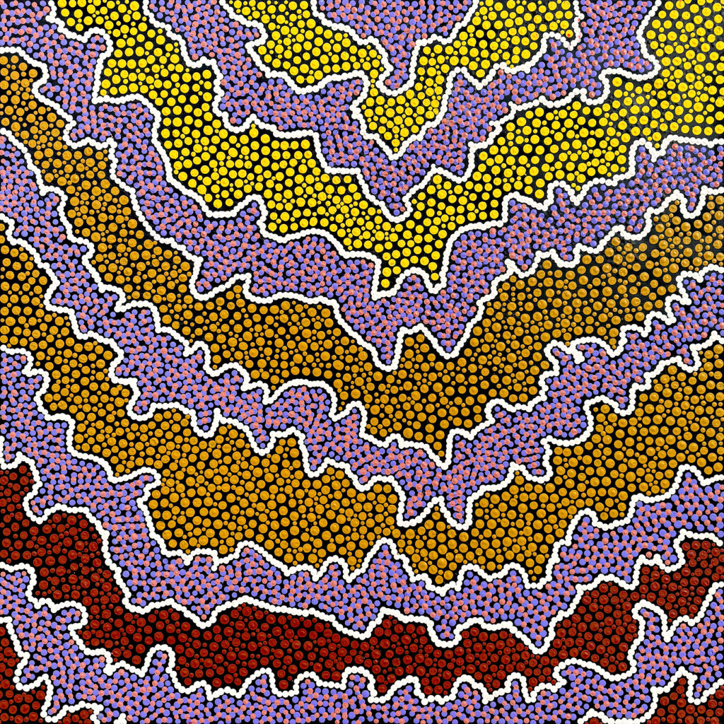 Elfreda belongs to a strong lineage of artists from the Ngaanyatjarra and APY Lands. She lives and paints in Blackstone, where she works, cares for her family, and continues to pass on cultural knowledge. This painting reflects not only a Tjukurrpa story but also a personal celebration of kinship, nourishment, and desert country.