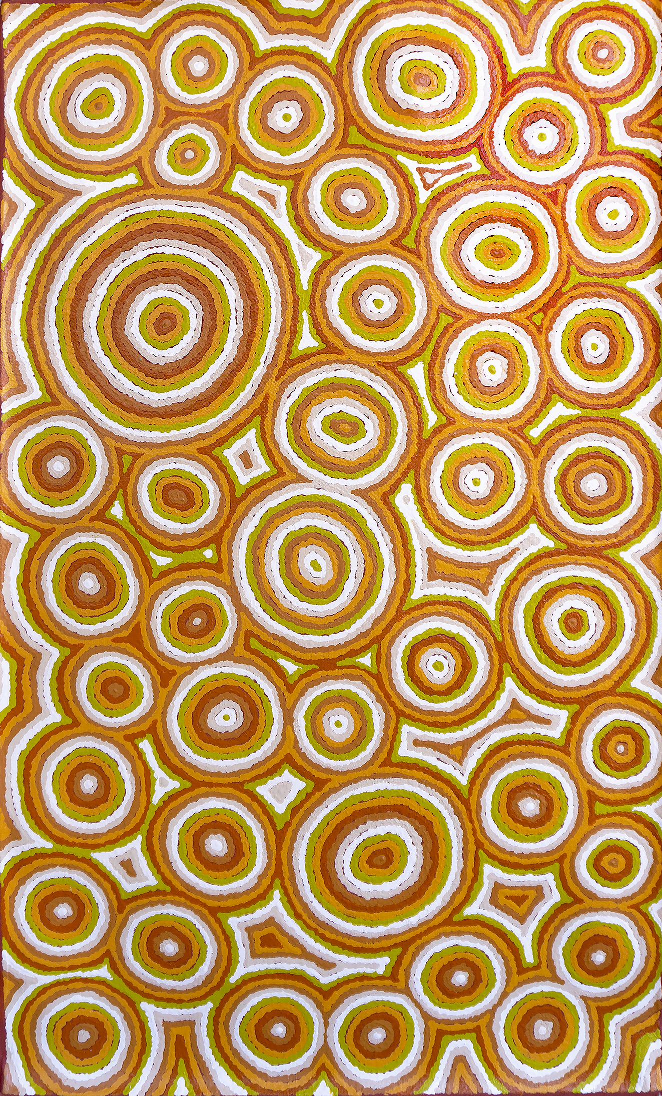 In this artwork Margie has painted Lukarrara Tjukurrpa (Desert Fringe Rush Seed Dreaming). This Tjukurrpa comes from a place north of Yuendumu in the Northern Territory where Margie is from.
