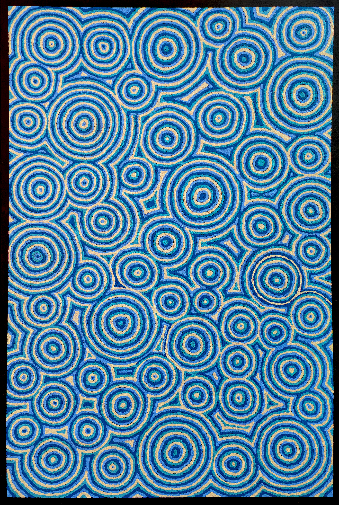 In this artwork Margie has painted Lukarrara Tjukurrpa (Desert Fringe Rush Seed Dreaming). This Tjukurrpa comes from a place north of Yuendumu in the Northern Territory where Margie is from.
